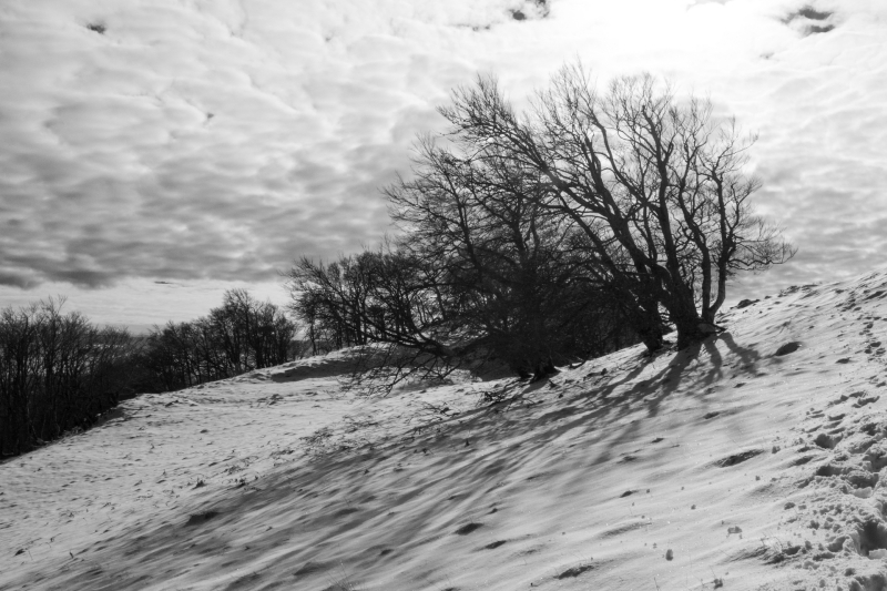 Nous avons été agréablement surpris par l'épais manteau de neige qui rendait un paysage de toute beauté : les sapins dégoulinants de neige, les houx rouges, les nuances de gris dans le fond de la vallée.